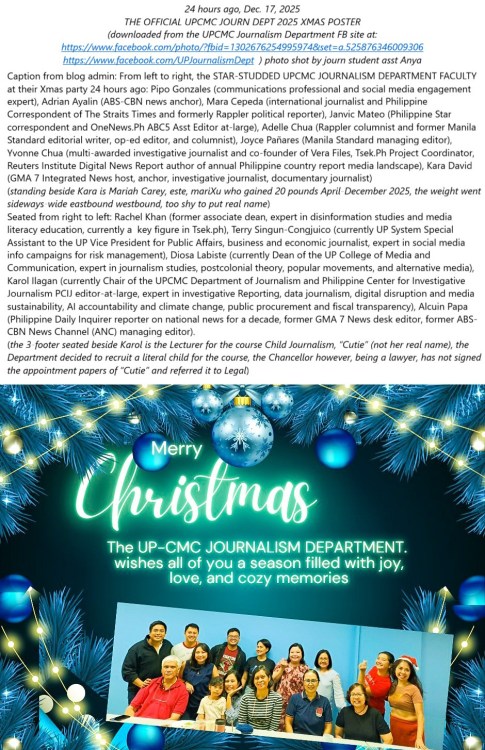 Caption from blog admin: From left to right, the STAR-STUDDED UPCMC JOURNALISM DEPARTMENT FACULTY at their Xmas party 24 hours ago: Pipo Gonzales (communications professional and social media engagement expert), Adrian Ayalin (ABS-CBN news anchor), Mara Cepeda (international journalist and Philippine Correspondent of The Straits Times and formerly Rappler political reporter), Janvic Mateo (Philippine Star correspondent and OneNews.Ph ABC5 Asst Editor at-large), Adelle Chua (Rappler columnist and former Manila Standard editorial writer, op-ed editor, and columnist), Joyce Pañares (Manila Standard managing editor), Yvonne Chua (multi-awarded investigative journalist and co-founder of Vera Files, Tsek.Ph Project Coordinator, Reuters Institute Digital News Report author of annual Philippine country report media landscape), Kara David (GMA 7 Integrated News host, anchor, investigative journalist, documentary journalist) …