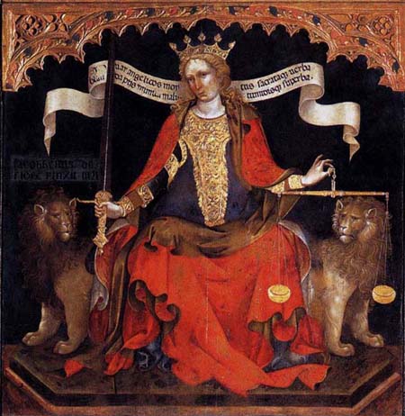 Jacobello del Fiore. Italian painter, Venetian school (b. 1370, Venezia, d. 1439, Venezia) Justice between the Archangels Michael and Gabriel . (detal) 1421. Tempera on panel, 210 x 190 cm. Gallerie dell’Accademia, VeniceDownloaded with express permission from the Web Gallery of Art at http://www.wga.hu from site admin Emil Kren, Ph.D.. Many thanks.