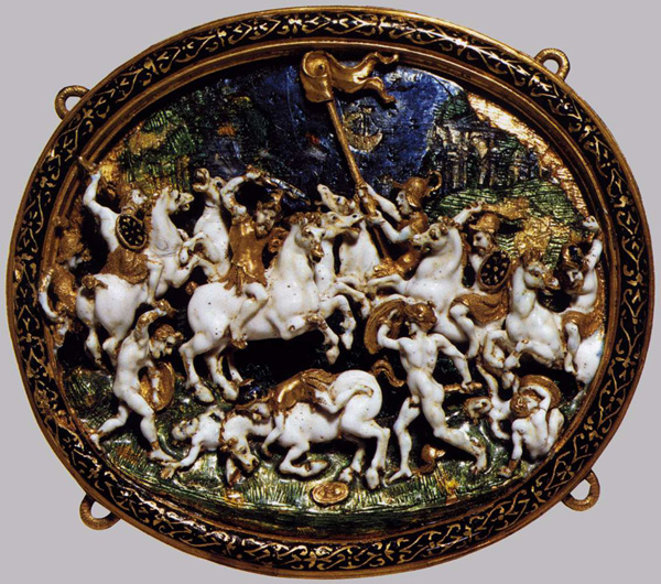 Enseigne with battle composition. circa 1538. Enamel, gold. ibliothèque Nationale, Paris. Downloaded with express permission from the Web Gallery of Art at http://www.wga.hu from site admin Emil Kren, Ph.D.. Many thanks.