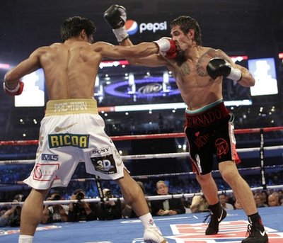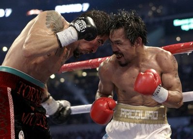 The Inquirer got it! They sure did. This is the photo that tells the story of how Manny Pacquiao beat a much bigger and much heavier Margarito. Yesterday, when I saw the stills used by the tv stations on the Pacquiao- Margarito bout, mostly photos of the Associated Press (AP), this was the photo i chose