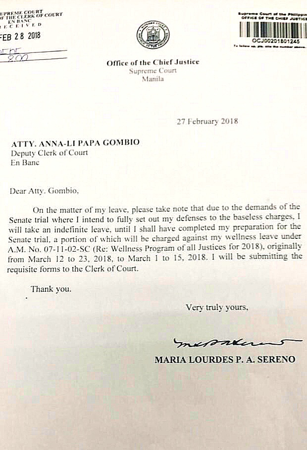 The terms of CJ Sereno’s leave (see letter dated Feb. 27, filed today Feb. 28) are definite and time-bound (for the duration of her preparation for trial), and not indefinite.