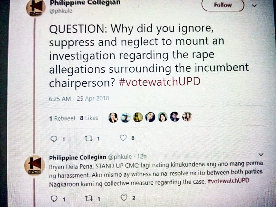 i saw this only now: an allegation of rape raised by the Collegian against a student candidate in the student council elections, brought up during the election debate-forum. The allegation of rape was not denied. Meron bang na- rape — Totoo ba ito? Kung hindi nangyari, dapat ay i-deny; kung totoong nangyari, hindi dapat ganito ang pag-handle.