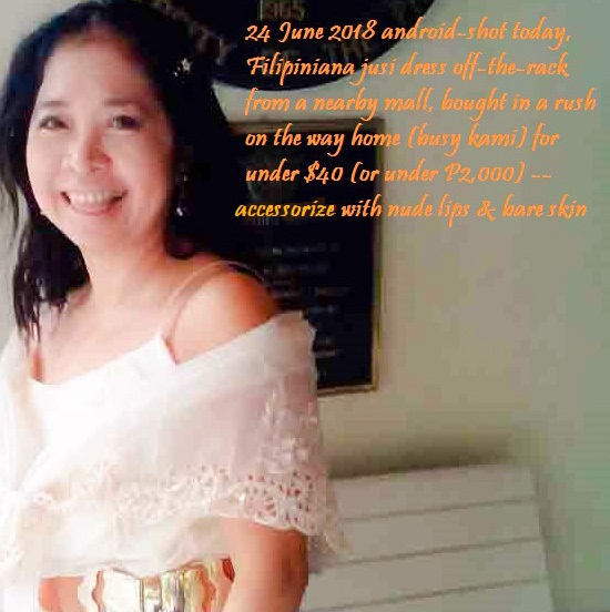 android-shot yesterday: Filipiniana jusi dress off-the-rack from a nearby mall (required for grad rites: ecru or off-white), bought on the way home, rush (busy kami) for under $40 dollars (or for under P2,000 pesos) — accessorize with nude lips and bare skin