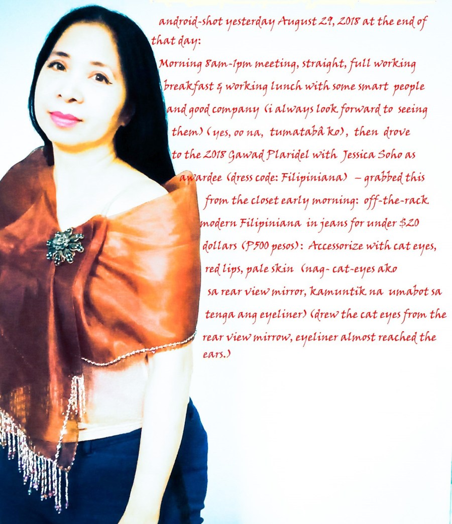 Rushed from an 8am-1pm meeting, straight, with a full working breakfast & working lunch with some smart people and good company (yes, oo, tumatabâ ko), then drove to the 2018 Gawad Plaridel with Jessica Soho as awardee (dress code: Filipiniana)