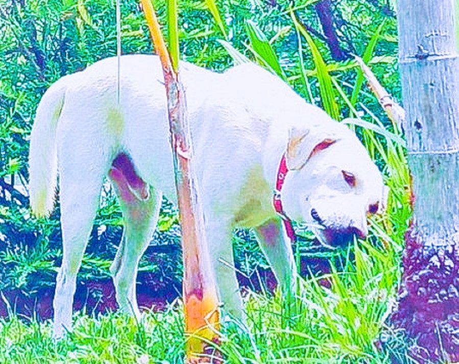 On the grassy knoll beside the University Avenue, west-bound, where no humans walked, he sprightly skipped along ten meters, behind a shrub, he dug a small hole … crunched up his body tense like an inverted parenthesis and … performed his absolution in five seconds. He then buried his excretion.