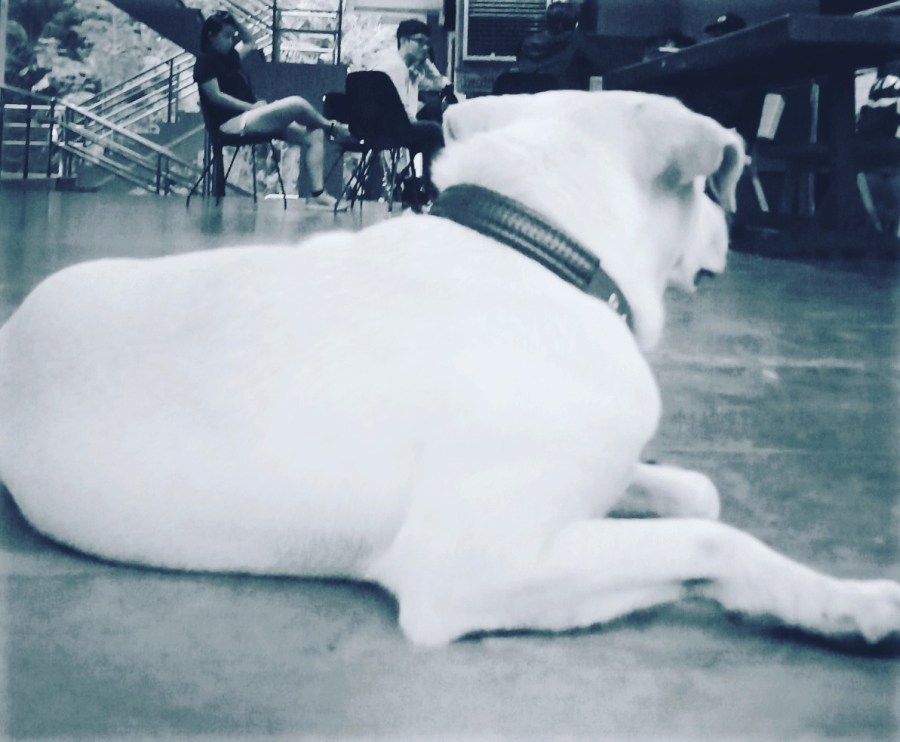 at the moment Cotton the University community dog listens to a group of young filmmakers,