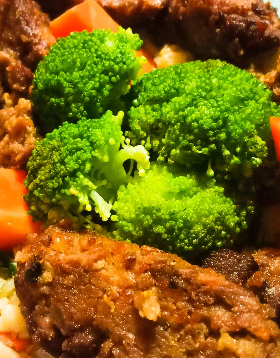 with steamed carrots and broccoli.