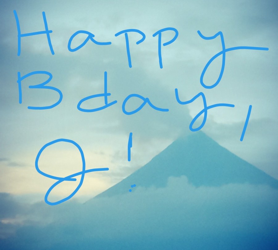(birthday poster produced 47.3 kilometers away from a breathing volcano using just a handheld device and my pinky as a stylus pencil to digitally inscribe the birthday greeting on an original photo of the steaming volcano shot by blog admin) (apologies for the crudeness, i packed in a rush without bringing my laptop)