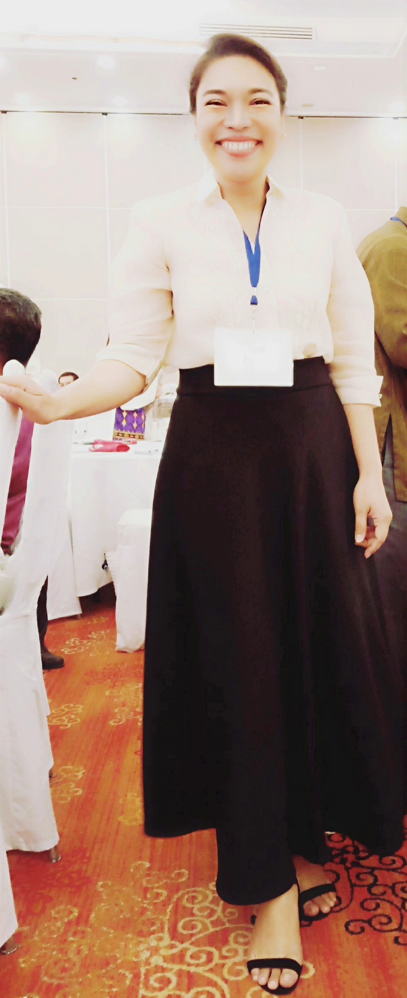 #OOTD Atty. Krissy Conti NUPL lawyer : Embroidered jusi barong Tagalog top for women and black wide hem skirt, accessorized with tiny gold loop earrings, minimalist black strappy sandals