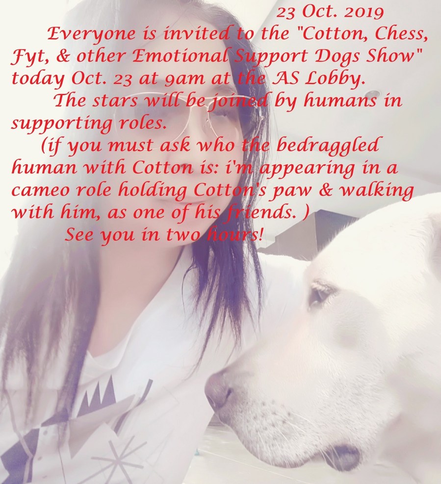 Everyone is invited to “The Cotton, Chess, Fyt, & Friends Dog Show” today 9am AS Lobby! See you in two hours!