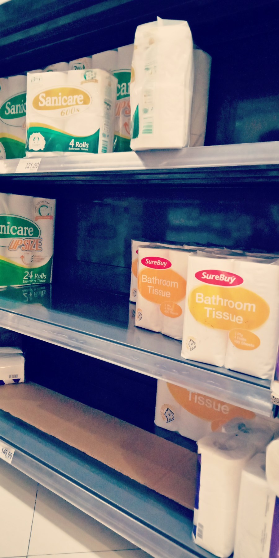 The government approved the Declaration of a Public Health Emergency at about 1pm today March 9. At about 8pm today or eight hours after the Declaration of Public Health Emergency, here’s what the grocery shelves looked like in Quezon City, center of the city : Half of the canned food items and half the toiletries are gone.