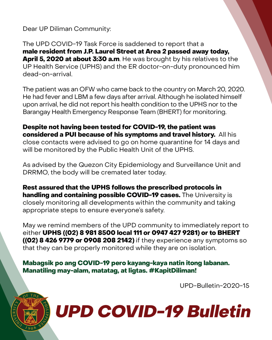 Posted at 9:23pm: Prayers, and message of support for the family ( a UP Diliman resident, on J.P. Laurel Street, Area 2, considered a PUI because of symptoms and travel history, died this morning April 5, two blocks from the student dorms). His close contacts, now home-quarantined, and considered as PUMs, should be provided food etc.