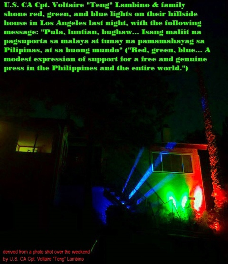 U.S. CA Cpt. Voltaire “Teng” Lambino and family shone red, green, and blue lights on their hillside house in Los Angeles last night, with the following message: “Pula, luntian, bughaw: … Isang maliit na pagsuporta sa malaya at tunay na pamamahayag sa Pilipinas, at sa buong mundo.” (“Red, green and blue: A modest expression of support for a free and genuine press in the Philippines, and the whole world.”)