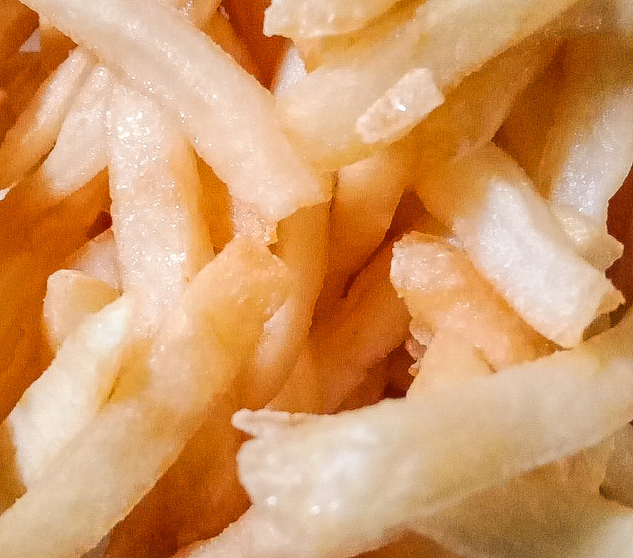 of fries and salt: Mommy peeling washed potatoes, slicing them into slivers…