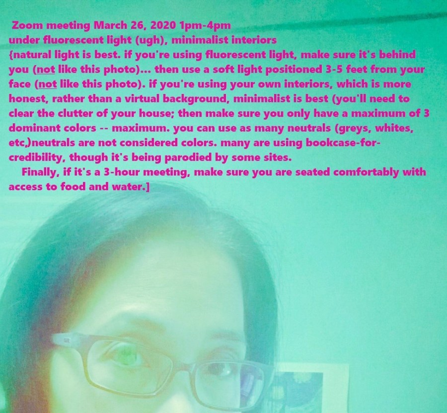 Photo shows a Zoom meeting last March 26, 2020 1pm-4pm under fluorescent light (not good), minimalist interiors. Natural light (sunlight) is best. If you’re using fluorescent light, make sure it’s behind you (not like in this photo)… then use a soft light positioned 3 to 5 feet from your face. If you’re using your own interiors, which is more honest, rather than a virtual background, you’ll need to clear the clutter of your house; then make sure you have only a maximum of three dominant colors — maximum. You can use as many neutrals (greys, whites, etc.), neutrals are not considered colors. Many are using bookcase-for-credibility, though it’s being parodied by some sites.