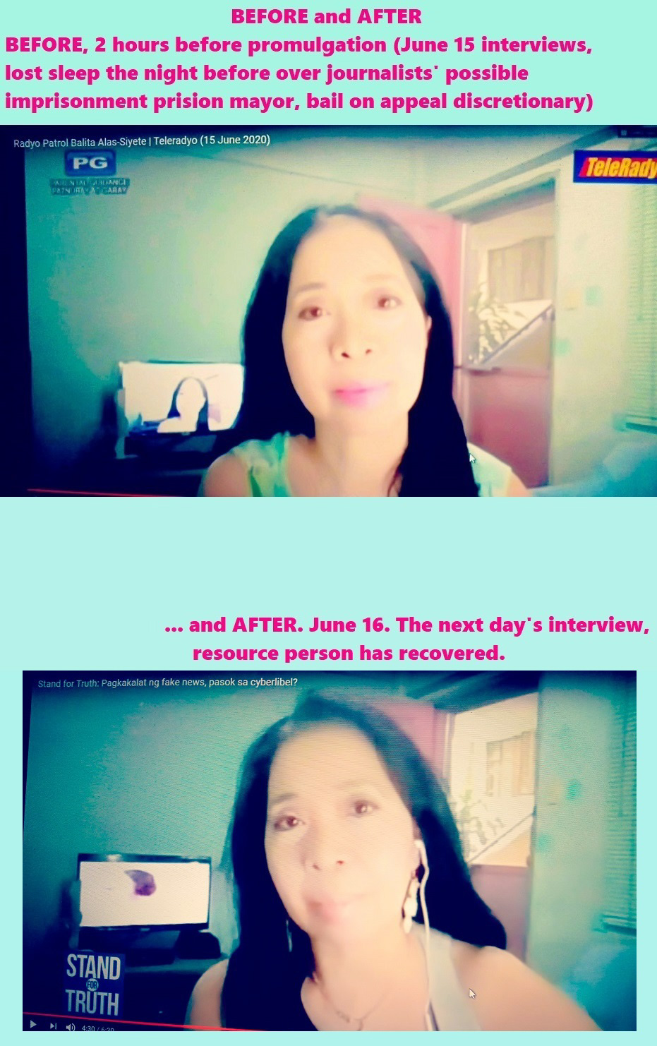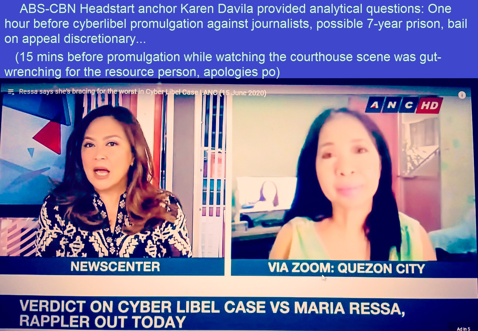 ABS-CBN Headstart anchor Karen Davila provided analytical questions: One hour before cyberlibel promulgation against journalists, possible 7-year prison, bail on appeal discretionary; 15 mins before promulgation while watching the courthouse scene was gut-wrenching for the resource person, apologies po