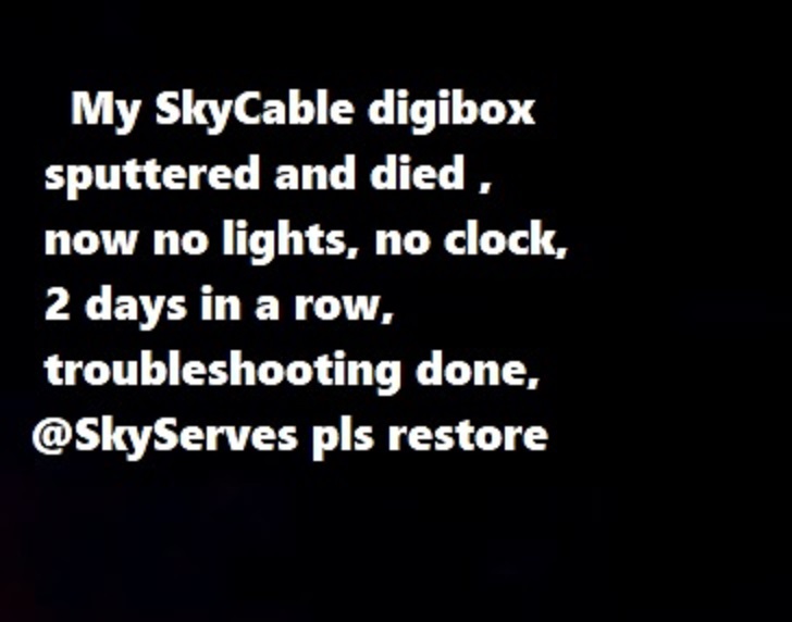 To @SkyServes after merely sending a link as reply: I sent a DM-reply five minutes ago. i already visited this site before i messaged you and, as stated in my message to you, i have performed all the troubleshooting measures — to no avail. My digibox had sputtered and died, it needs to be collected by the undertaker. It also says there that if the red light does not go on even on standby mode and if the clock no longer lights up, it is time to replace the digibox, by calling up the Sky Cable technician. Please read your own “How-Tos Troubleshooting Guide” and “FAQs” that you provided in the link instead of delaying action on the dead digibox. Please replace the digibox, that’s what stated there. I will pay for it. Or, in order to assist and be of service to you, and even if I’m avoiding crowds — just to help you address a customer’s concern — I can drive to your store in Sky Zone at the mall and look at the products and see if I can buy the same digibox if that would work for you. Please let me know. Tnx.