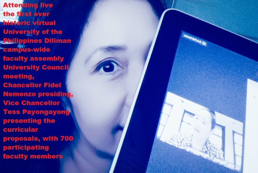 Historic University of the Philippines Diliman campus-wide faculty assembly University Council by Zoom with Chancellor Fidel Nemenzo presiding, Vice Chancellor Tess Payongayong presenting the curricular proposals, with 700 registered participants (faculty members)