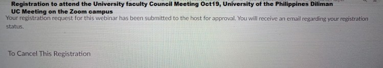 University of the Philippines Diliman University faculty Council (UC) Regular Meeting on the Zoom campus Oct. 19, 2020 at 8:30 am (see your email, you need to register on or before Oct. 12. )