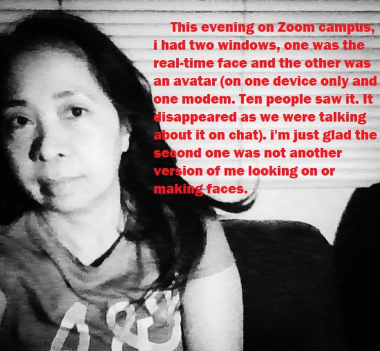 This evening on Zoom campus, i had two windows, one was the real-time face and the other was an avatar (on one device only and one modem. Ten people saw it. It disappeared as we were talking about it on chat). i’m just glad the second one was not another version of me looking on or making faces.
