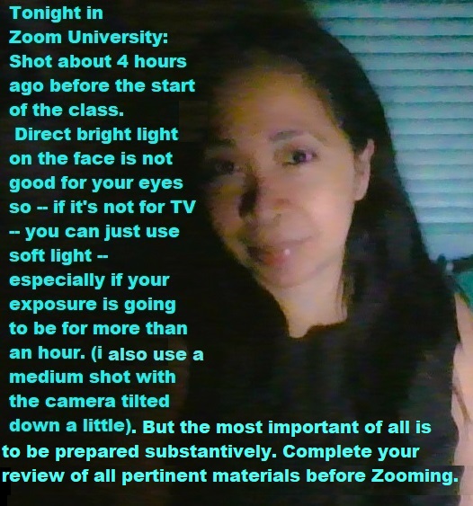 Tonight in Zoom University: Shot about 4 hours ago using the old laptop camera, before the start of the class. Direct bright light on the face is not good for your eyes so — if it’s not for TV — you can just use soft light, especially if your exposure is going to be for more than an hour. (i use a medium shot with the camera tilted down a little). But the most important of all is to be always prepared substantively (complete your review of all the pertinent materials) before appearing in Zoom. Substance before form.