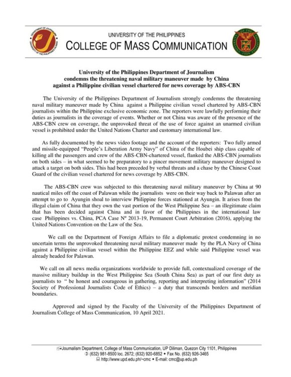 The University of the Philippines Department of Journalism strongly condemns the threatening naval military maneuver made by China against a Philippine civilian vessel chartered by ABS-CBN journalists within the Philippine exclusive economic zone. The reporters were lawfully performing their duties as journalists in the coverage of events. Whether or not China was aware of the presence of the ABS-CBN crew on coverage, the unprovoked threat of the use of force against an unarmed civilian vessel is prohibited under the United Nations Charter and customary international law.