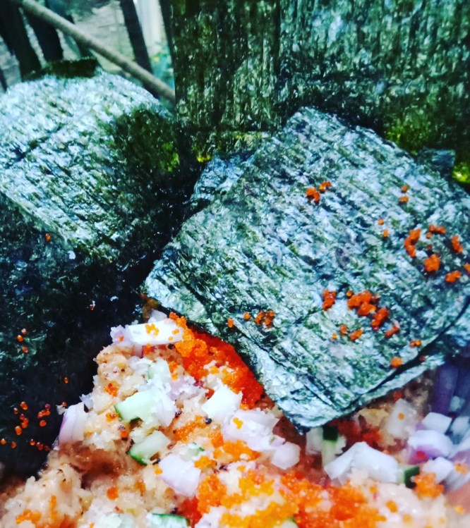 …it also had finely chopped raw carrots, finely chopped raw sweet onions, and a hint of finely chopped raw green mangoes — the Tobiko (fish roe) wasn’t my idea, apologies