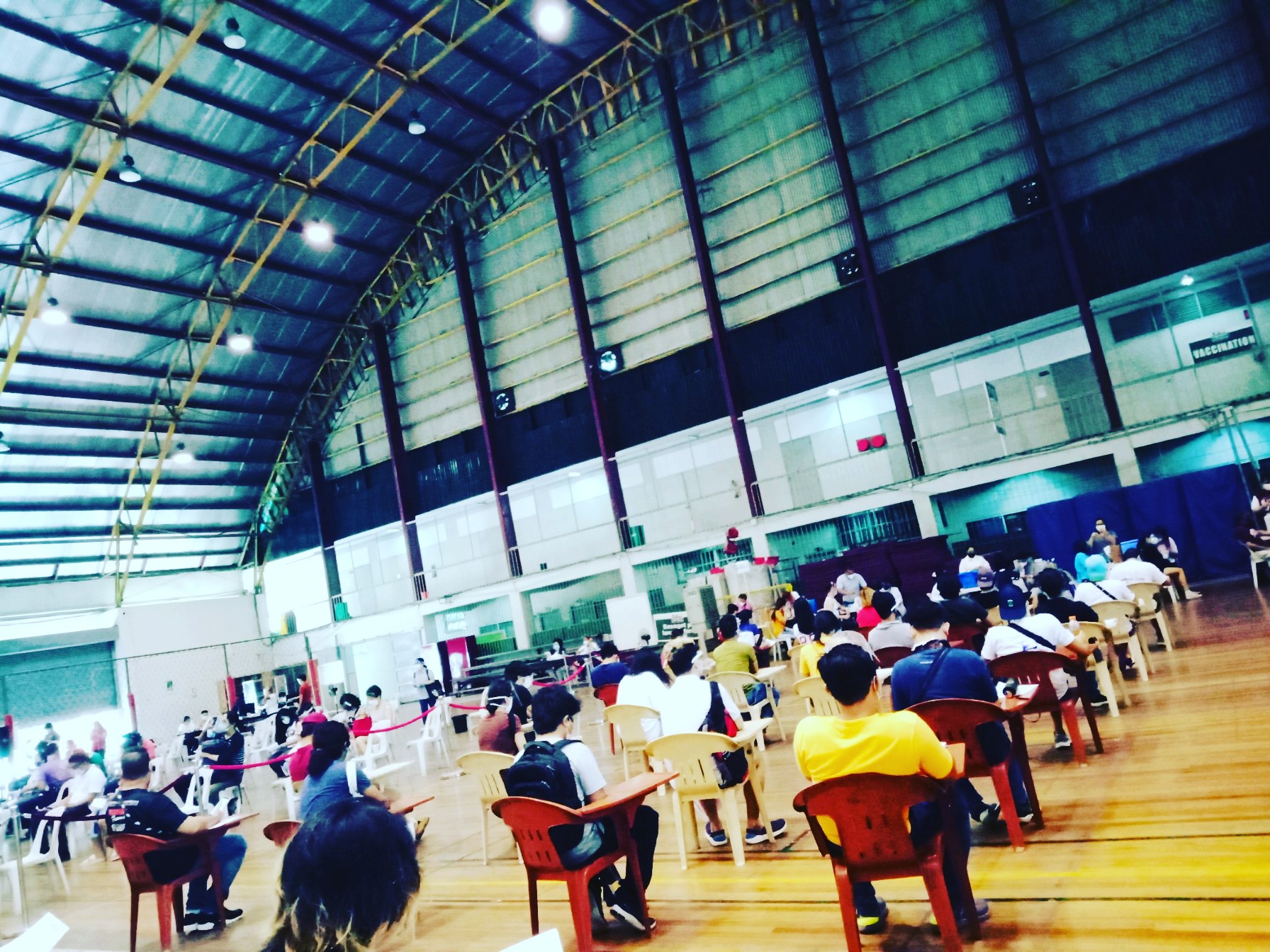 About the site: Before the pandemic, the University of the Philippines Diliman College of Human Kinetics Gymnasium – Basketball Court was also home to student-gymnasts, volleyball players, ballet dancers, cheer dancers, folk dancers, hip-hop etc, fencing athletes, weightlifters, table tennis players, and all sports science and physical education faculty and students, aside from servicing about 5,000 students taking up their P.E. classes (U.P. requires 12 units of P.E.), and in the summer/midyear break, it offers physical recreational classes to the U.P. community (all these activities explain the floor mats and equipment you see stashed on the side close to the walls of the gym). Nowadays, it is the spacious and airy site for the vaccination of U.P. Diliman community members (photo shot yesterday)