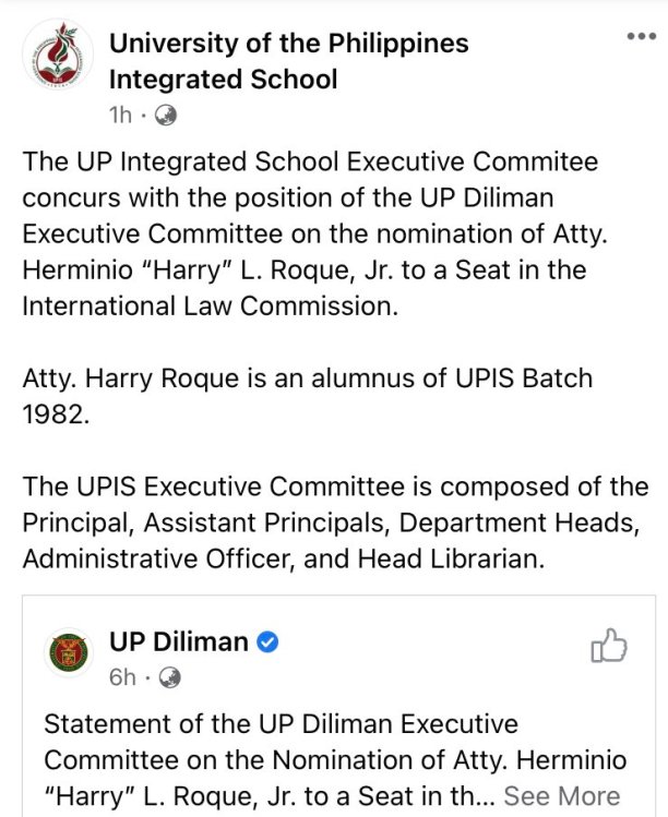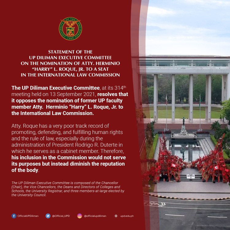 The Deans of the University of the Philippines (UP) Diliman constituted as the UP Diliman Executive Committee, joined by the UP Integrated School high school principal, department heads, librarian, and staff, in a move unprecedented in history, issued an official resolution and statement opposing the nomination of its alumnus, Harry Roque, presidential spokesperson, to the UN International Law Commission, and stressed that: “He has a very poor record of defending human rights…” .