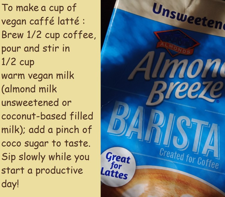 To make a cup of vegan latté : Brew 1/2 cup of coffee, stir in 1/2 cup of warm vegan milk (almond milk, unsweetened, or any ordinary coconut-based filled milk, then add a pinch of coco sugar to taste. Sip slowly while you start a productive day!
