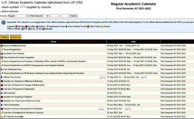 The University of the Philippines Diliman (UP Diliman) Academic Calendar is uploaded below, as a jpeg file, rightclicked from UP Diliman CRS, with check marks √ √√ for emphasis embedded by blog admin
