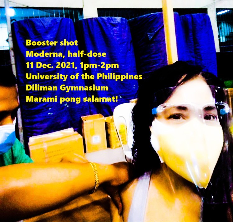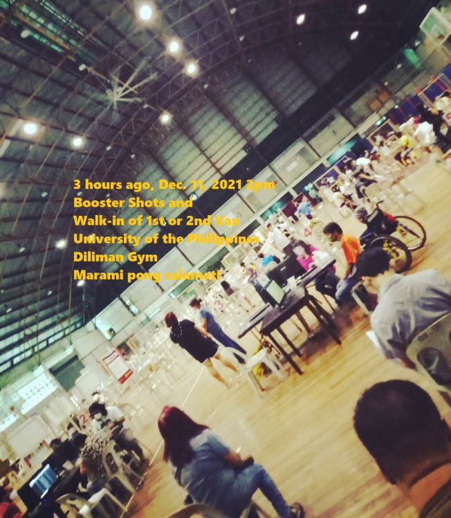 Shot 3 hours ago: Booster shot, Moderna half-dose, University of the Philippines Diliman Gymnasium UP College of Human Kinetics. Marami pong salamat sa University of the Philippines Diliman administration and University of the Philippines System, sa Quezon City local government, at sa lahat ng nagtrabaho sa pamahalaan at iba pa upang makamit ang mga bakunang mas mataas ang efficacy at sa mas angkop na halaga, na binayaran ng lahat ng mamamayan sa pamamagitan ng kanilang buwis — (nagbabayad tayong lahat ng buwis, maliban yata yung isang kandidato dyan)