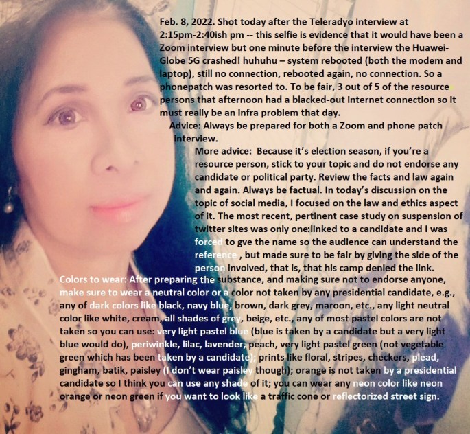 Feb. 8, 2022. Shot today after the Teleradyo interview at 2:15pm-2:40ish pm — this selfie is evidence that it would have been a Zoom interview but one minute before the interview the Huawei-Globe 5G crashed! huhuhu – system rebooted (both the modem and laptop), still no connection, rebooted again, no connection. So a phonepatch was resorted to. To be fair, 3 out of 5 of the resource persons that afternoon had a blacked-out internet connection so it must really be an infra problem that day.
