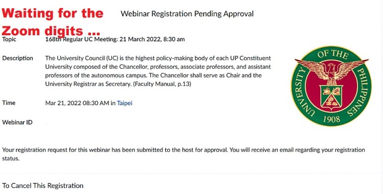 Waiting for the Zoom digits to the UC 8:30am Meeting today (UP Diliman-campus-wide meeting of faculty members)