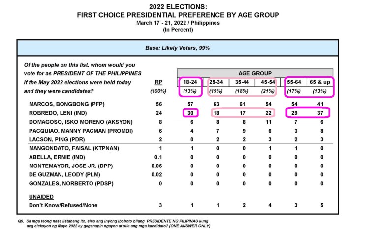 Latest Pulse Asia survey March15-21 by age group, view here: They can be characterized by information media or disinformation medium: the Tiktok generation and the originally-TV-SMS generation (the generation that led the ouster of Marcos and/ or Erap) are carrying Leni up. (Based on studies, Facebook is the hub of disinformation — that’s where the FB age groups belong — this can be addressed by more fact-checking work in-person, H2H, online, etc.)