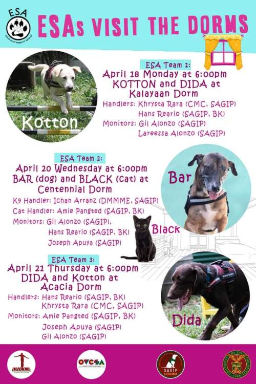 Kotton / Cotton and other emotional support dogs 🐕 🐶 and Black the cat 🐱will visit the dorms these Easter weekdays to see students and help everyone ease thru their worries and work — you can join them — see sked in the pubmat below