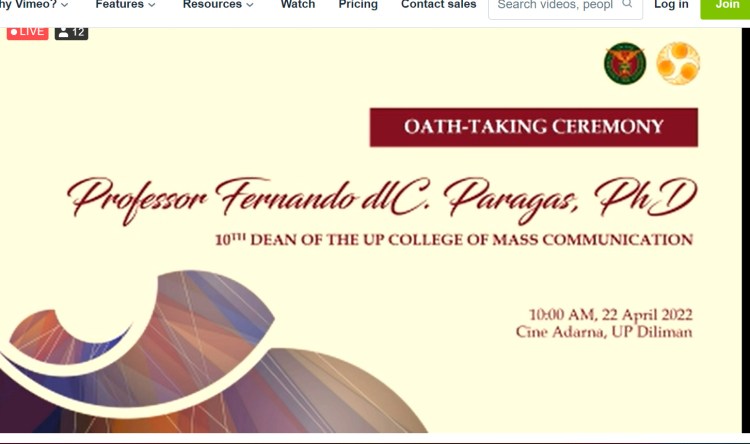 Titles: Happening now 10am The Oathtaking of UP College of Mass Communication Dean Fernando “Ernan” Paragas, Phd, University of the Philippines Diliman, live in person face-to-face, with a live audience at the UPCMC Film Center and online all over the world