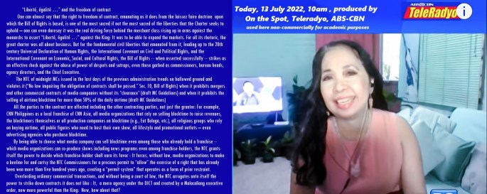 The NTC of midnight MCs issued in the last days of the previous administration treads on hallowed ground and violates it (“No law impairing the obligation of contracts shall be passed.” Sec. 10, Bill of Rights) when it prohibits mergers and other commercial contracts of media companies without its “clearance” (draft MC Guidelines) and when it prohibits the selling of airtime/blocktime for more than 50% of the daily airtime (draft MC Guidelines)