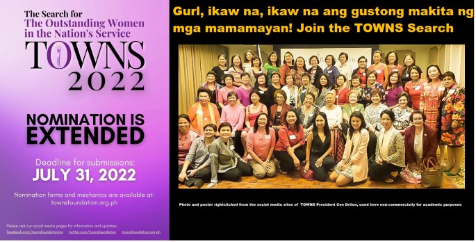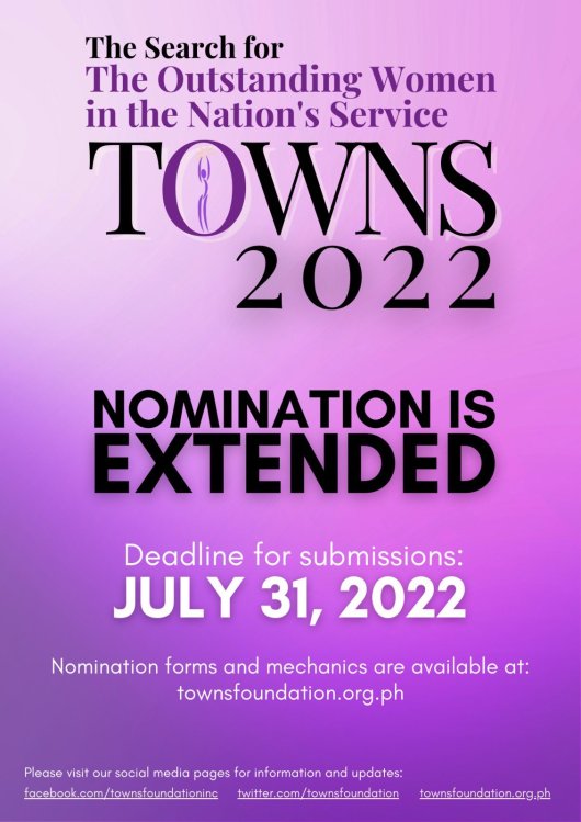 “The Search for The Outstanding Women in the Nation’s Service 2022 (TOWNS Award 2022) is extended to July 31, 2022! See mechanics and nomination forms at https://townsfoundation.org.ph/ “
