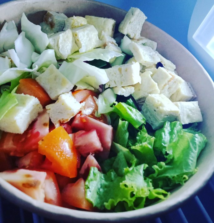 …wait, there’s scrambled eggs cut into cubes in it — you can replace that with tofu for a 100% vegan plate