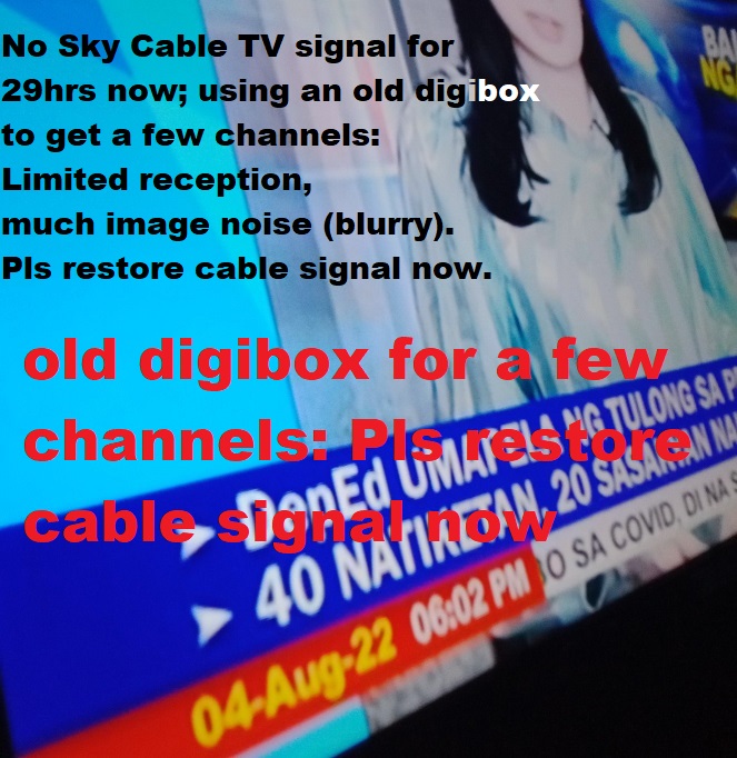 For @SKYServes Sky Cable TV : 29 hours of no-signal, wala pa rin! Sky tech team texted 11:42am: two blocks of houses of about 100 residents here have no cable signal. Your Sky Eng’g Dept was supposed to send equipped team to climb up the poste to solve the problem: No one arrived. we’re using an old digibox now just to get a few blurry channels. Pls resolve the problem asap.