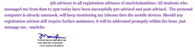 5th general advisory for all registration advisees of marichu lambino Discover more from marichulambino.com Subscribe to get the latest posts sent to your email. Type your email… Subscribe Rate this:click any social media icon below to share Share on Facebook (Opens in new window) Facebook Share on X (Opens in new window) X Share on Tumblr (Opens in new window) Tumblr Email a link to a friend (Opens in new window) Email Share on Pinterest (Opens in new window) Pinterest Print (Opens in new window) Print Share on Reddit (Opens in new window) Reddit Like Loading...