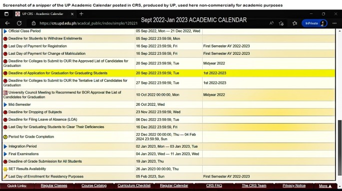 The UP Academic Calendar is embedded below. Official Class Days are from September 5, 2022 to December 21, 2022, followed by Integration, Exam Week. Then, January 19, 2023: Submission of Grades