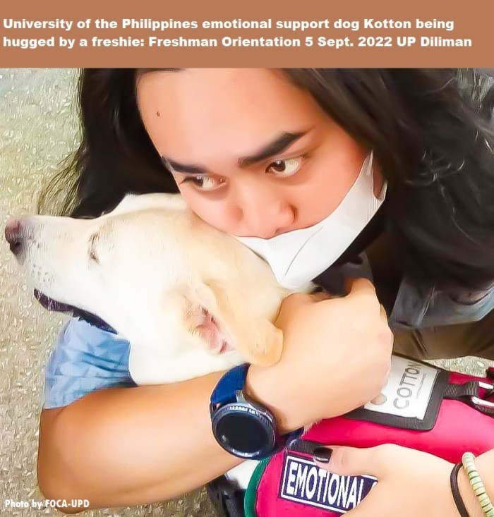 Kotton and the Freshies in photos #UniversityofthePhilippines #UPDiliman Emotional Support Dogs give comfort and the familiarity of home to incoming freshmen during the Freshman Orientation in-person … the first after two years of the pandemic