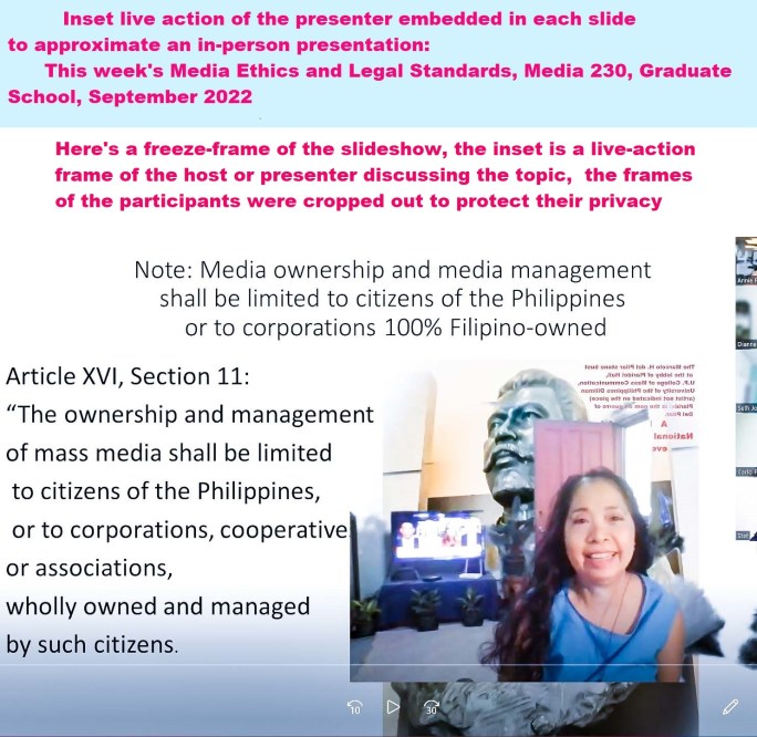 Inset live action of the presenter embedded in each slide to approximate an in-person presentation: This week’s Media Ethics and Legal Standards, Media 230, Graduate School #Powerpoint #UniversityofthePhilippines #UPDiliman