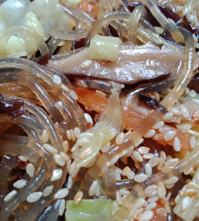 Japchae : Korean stir-fried glass noodles with vegetables, mushrooms, and sesame seeds #vegan #vegetarian #PlantBased Late #Breakfast #GoodMorning