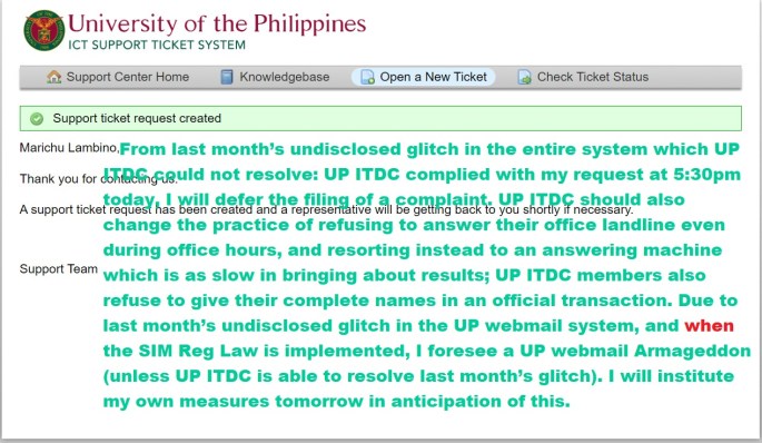 From last month’s undisclosed glitch in the entire system which UP ITDC could not resolve: UP ITDC complied with my request at 5:30pm today, I will defer the filing of a complaint. UP ITDC should also change the practice of refusing to answer their office landline even during office hours, and resorting instead to an answering machine which is as slow in bringing about results; UP ITDC members also refuse to give their complete names in an official transaction. Due to last month’s undisclosed glitch in the UP webmail system, and when the SIM Reg Law is implemented, I foresee a UP webmail Armageddon (unless UP ITDC is able to resolve last month’s glitch). I will institute my own measures tomorrow in anticipation of this.