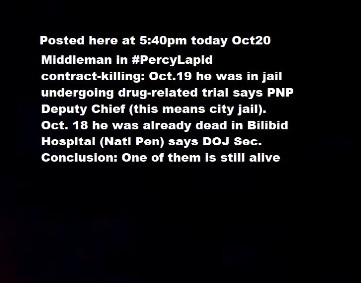 Posted at 5:40pm today Oct20, scroll down: “Middleman in #PercyLapid contract-killing: Oct.19 he was in jail undergoing drug-related trial says PNP Deputy Chief (this means city jail). Oct. 18 he was already dead in Bilibid Hospital (Natl Pen) says DOJ Sec. Conclusion: One of them is still alive”