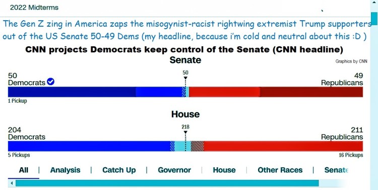 Midterm Elections 2022 The Gen Z zing in America zaps the misogynist-racist rightwing extremist Trump supporters out of the US Senate 50-49 Dems