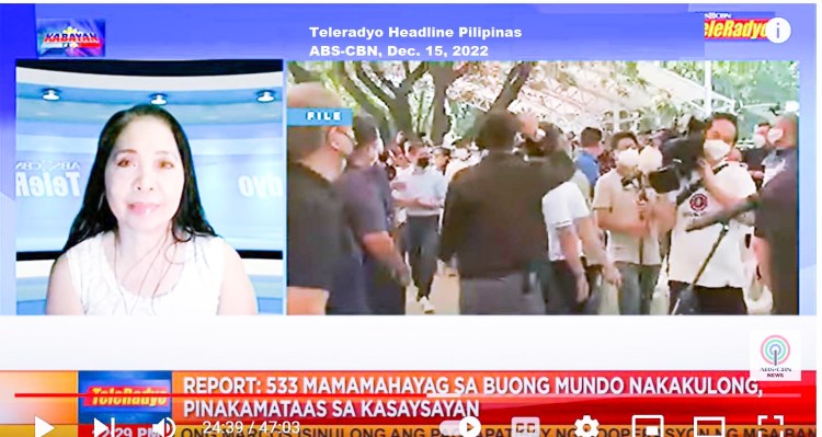 17 hours ago, Teleradyo Headline Pilipinas, ABS-CBN noontime news program: Report: A record-high of 533 journalists worldwide arrested and detained